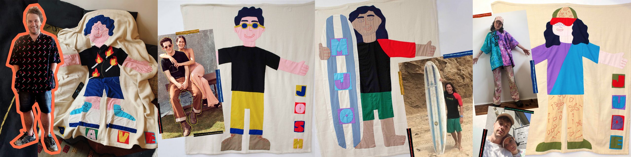 The idea for the ‘Covid Comfort Blankets’ came after its London-based Head of Design, June Frangue, became separated from his partner Dave, who’s been based in Australia for the last 18 months due to travel bans. After a chat with Frangue about his partner and their personality traits, Warby also used photographs to draw inspiration for the textile version of Dave – all in her distinctive humorous and cheeky style.