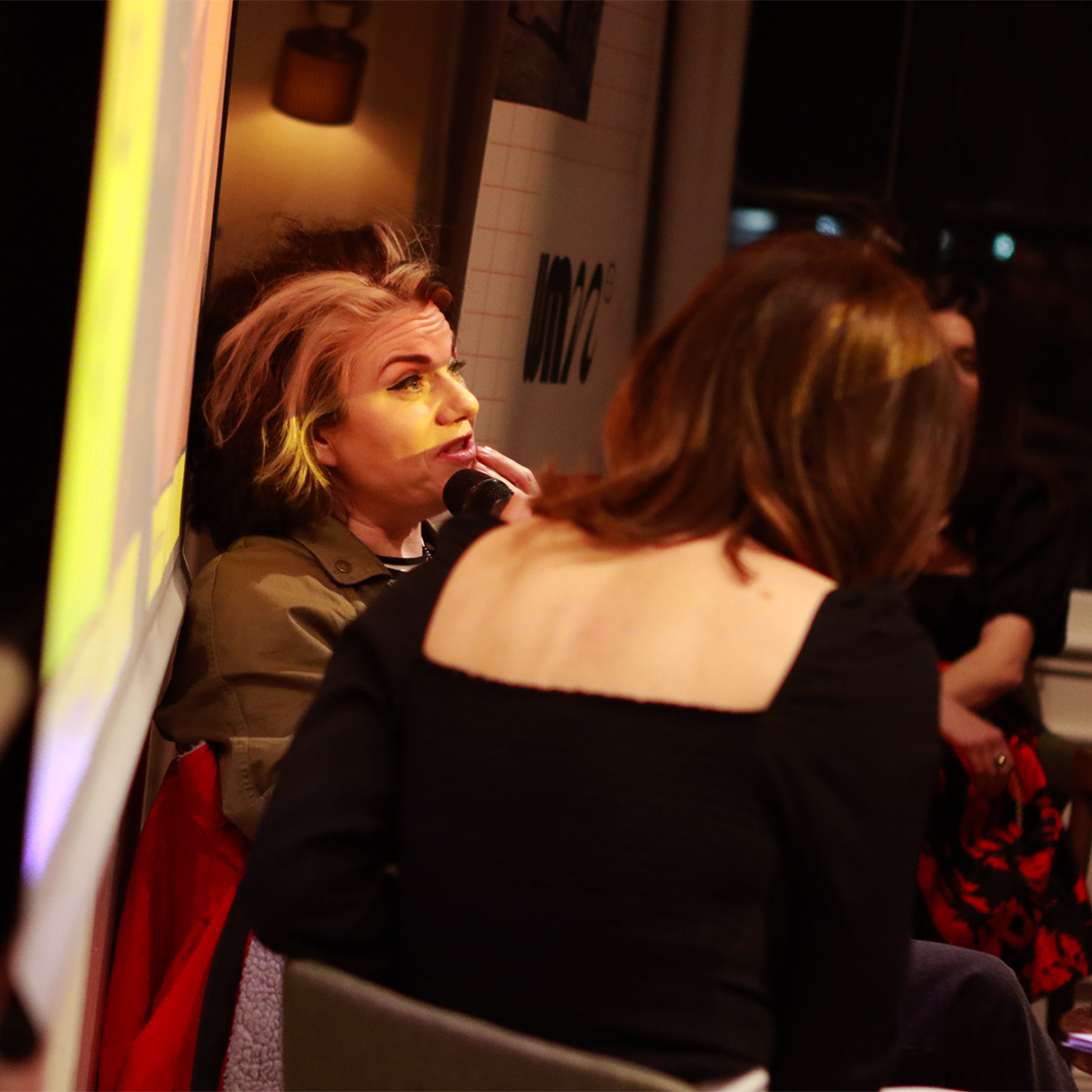 We started the night off with drinks and nibbles, and before we turned to Caitlin, we gave everyone a sneak peek of our new campaign for International Women’s Day. Called “Double Standards”, this year the campaign’s all about language, and the unconscious bias hiding in the words and phrases we use every day. Seeing the posters started some interesting conversations, and we can’t wait for the official launch on 8th March.